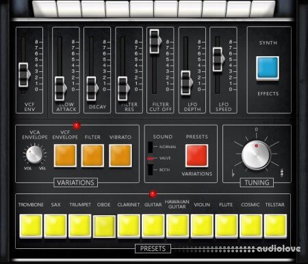 All easily accessible from a drop down menu for fast and easy access to the sounds.Exploration 1 has lots of greats sounds, including classic ARP leads, bass, drones, sound effects and keys and comes supplied with over 200 presets all easily tweaked or created from scratch using the custom GUI by saintjohnbaxter.Many extra features were added such as arpeggiator, effects, mono modes with note priority selection switches, midi syncable lfos etc.The beautiful tones from the ARP explorer can now be used in your own productions to give you the classic vintage vibe from what is undoubtedly a classsic synth.