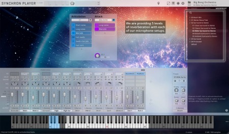Synchron Timpani III features five Adams Artist Alpha timpani with diameters of 20, 23, 26, 29, and 32, played with hard mallets, as well as the “Big Timpani” setup of Big Bang Orchestra Fornax