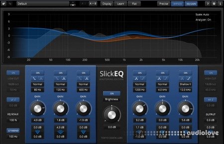 An effective auto gain mechanism automatically compensates for changes of perceived loudness while operating the EQ, smart signal analysis options allow matching the input signals spectrum against a reference; automatically find static resonances; or automatically setting the HP and LP filters according to the signals audible bandwidth.
